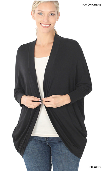 This luxuriously soft rayon span crepe Cocoon Wrap Cardigan is the perfect wardrobe addition to achieve effortless elegance. Boasting a warm 95% rayon and 5% spandex blend, this stylish wrap offers a cozy fit and a timeless style that is sure to turn heads.