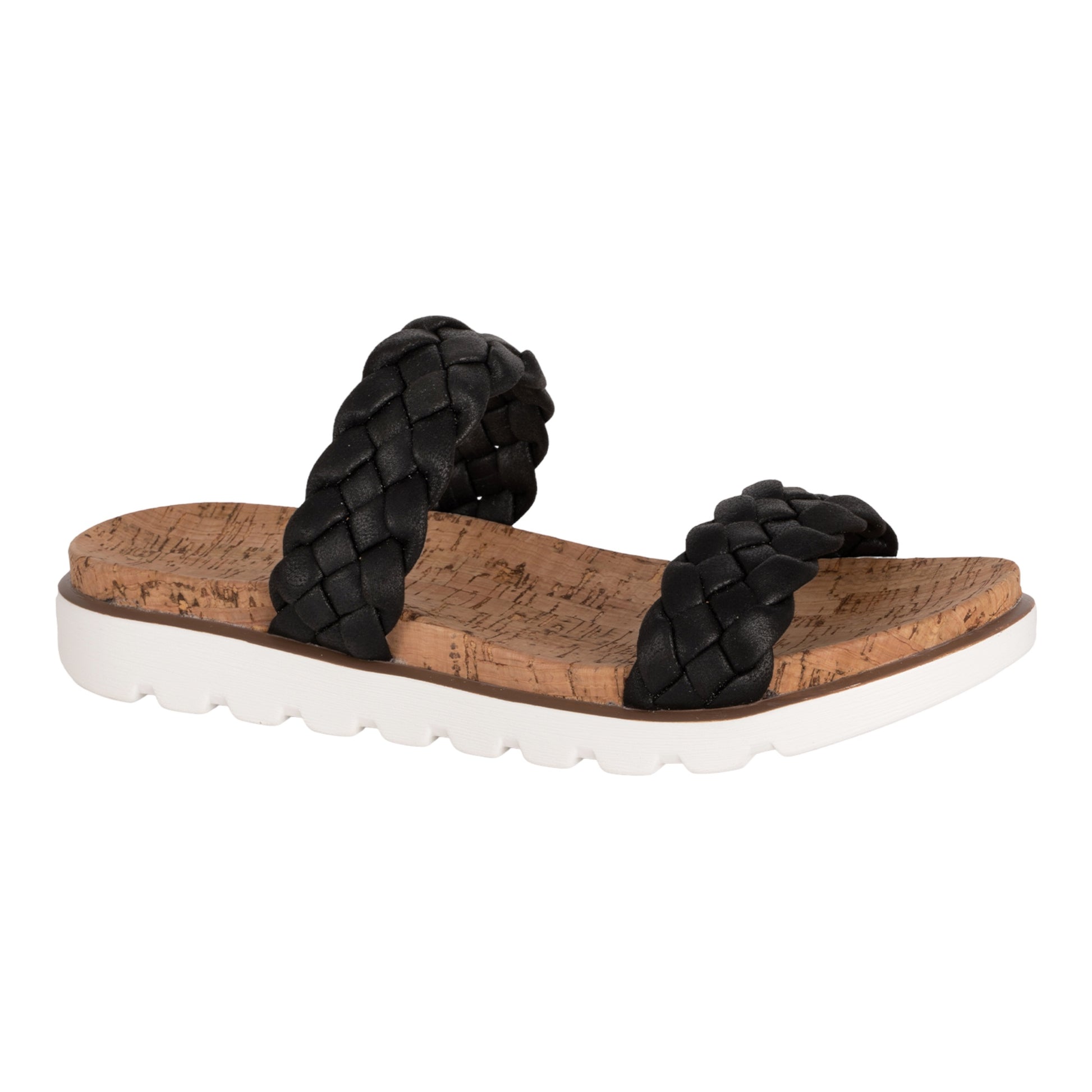 This woven double strap sandal is a must for the warm months! It is lightweight and will go with everything! This shoe features two woven straps and a cork insole for stability and cushion! It also has a 1" rubber platform bottom for extra cushion and support.