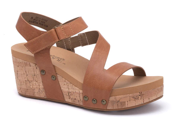 Check out these neutral wedge sandals in cognac! The Spring Fling is a criss-cross wedge with an adjustable ankle strap. Corky's is known for it's cork platform and cushioned footbed. Not only will this wedge look smokin' paired with a sundress, shorts, or cropped jeans.....they are comfortable!