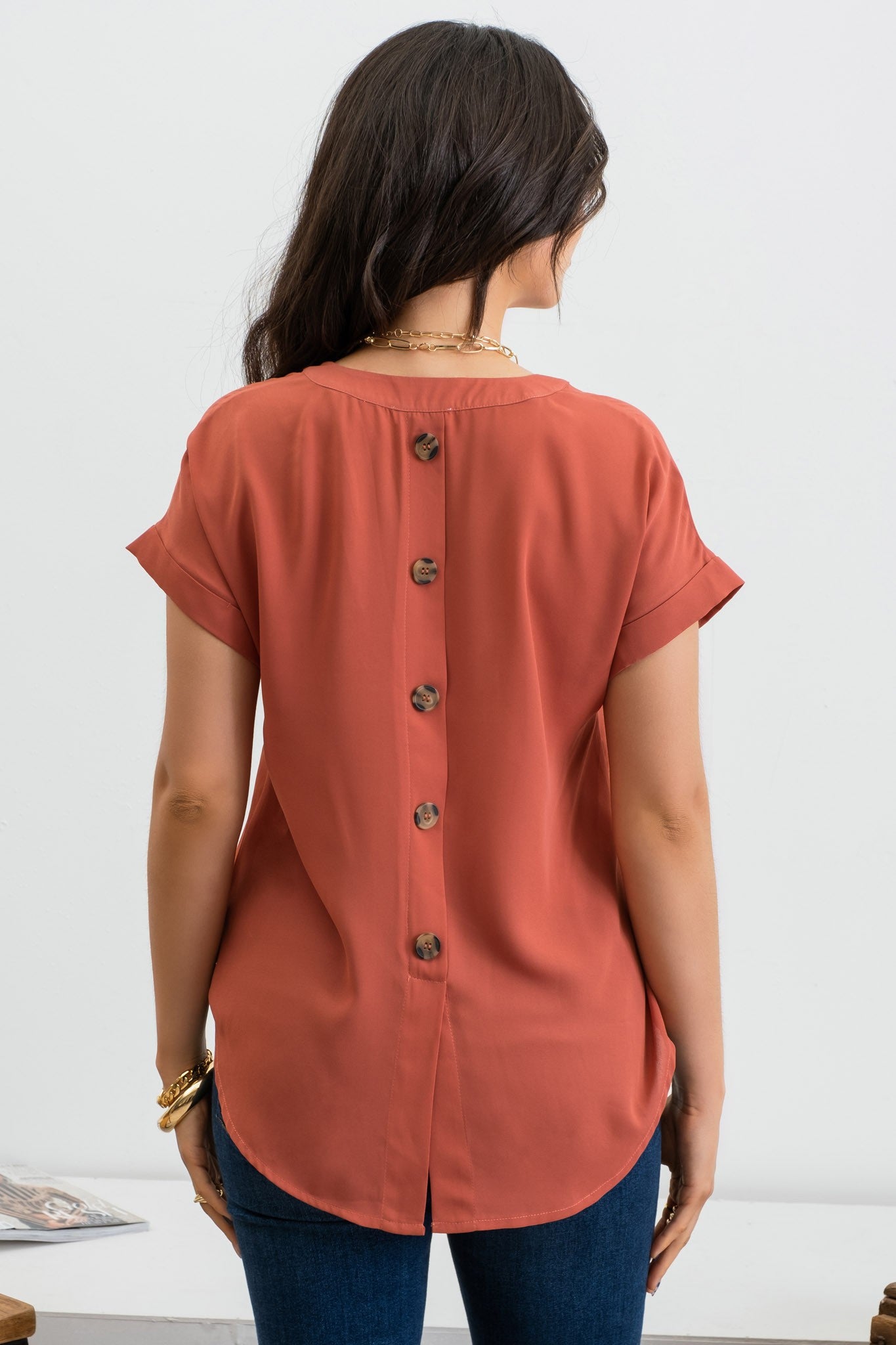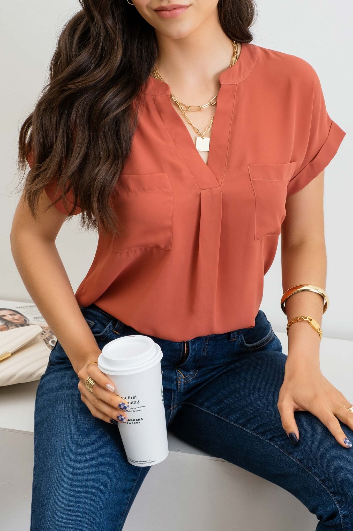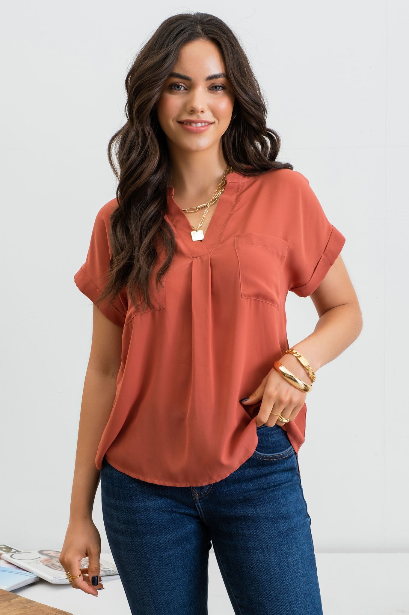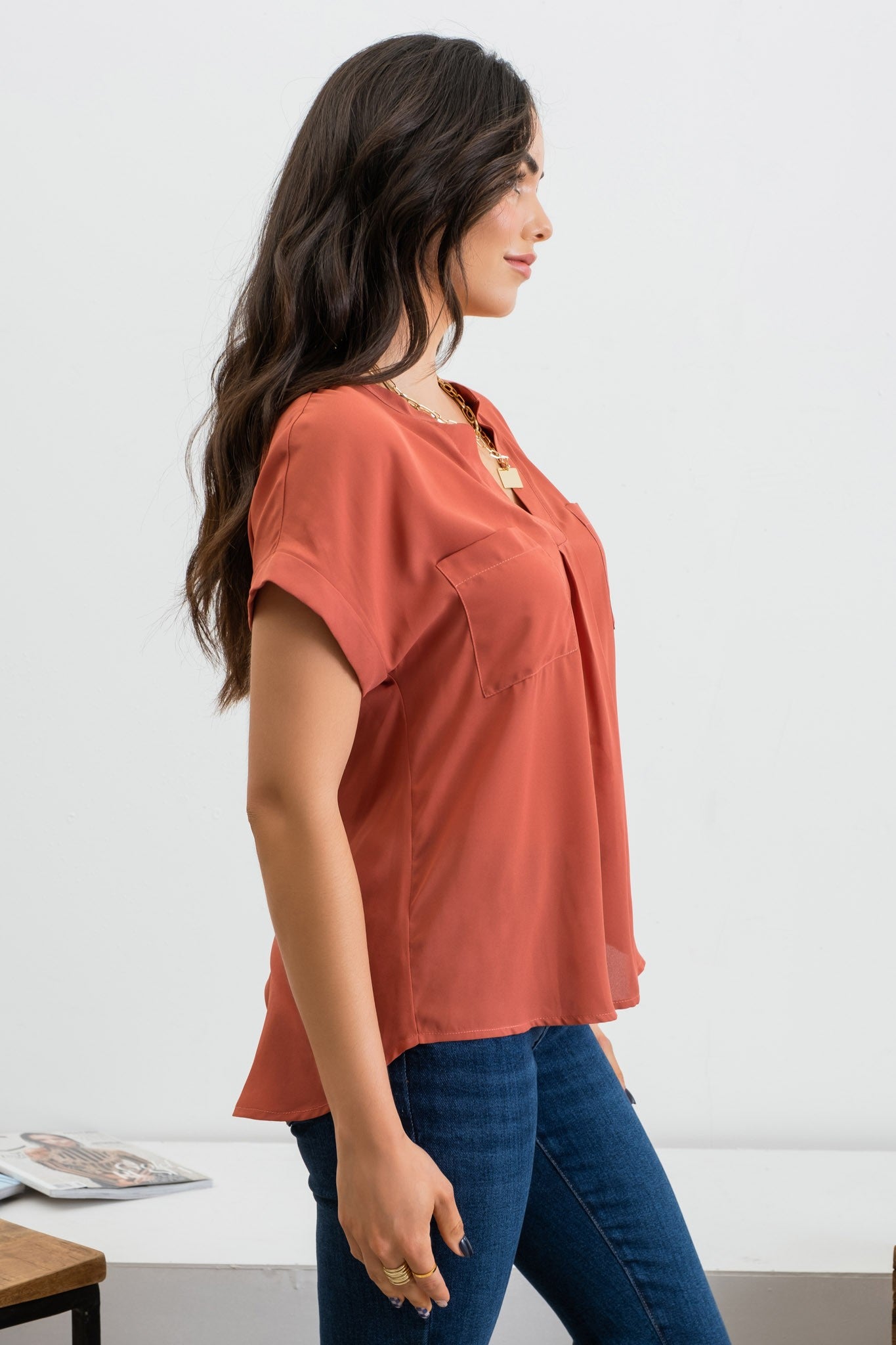 Introducing the Evelyn Split Neck Front Pocket Top: a sophisticated woven top with a split neck and front pocket detail, crafted from lightweight 100% polyester. Featuring a back button detail, short folded sleeve and split back hem, available in Terracotta or White. Step out in elegance with this timeless top.