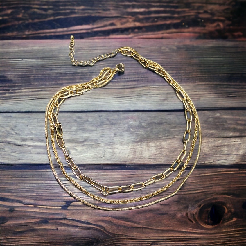 A basic high-polish layered necklace featuring anchor chains, snake chain, rope chain on a lobster-clasp closure.