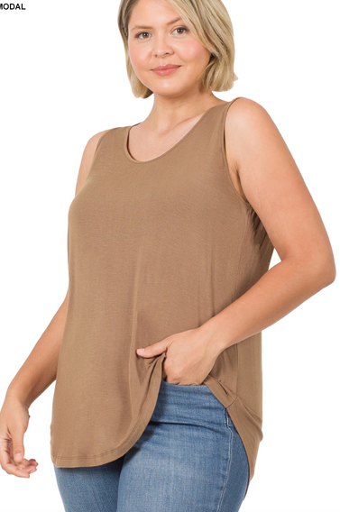 The Curvy Britney Modal Sleeveless Top is constructed with luxurious tencel modal and tailored specifically for curves. Its unique hi-lo hem offers an elegant, contemporary silhouette, while a round neckline and hem add a touch of sophistication. Perfect for any occasion.